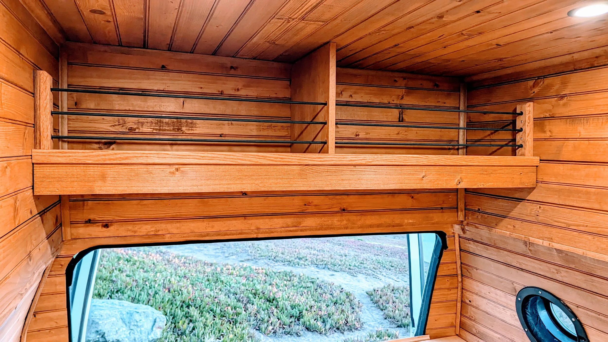 This rig was built to be simple and yet functional, lined with cedar paneling it brings in warmth and cozy vibes. This rig is an excellent companion when it comes to hitting the surf, shredding the powder, or a quick camping trip on the weekend. The van has a 200-watt solar set up with 200ah batteries to keep the lights on, food cold, and a diesel heater to keep things toasty when it gets chilly. There is a rear shower out of the garage and a 20-gallon water tank to keep the water supply strong. The ceilings come with 80/20 extrusion bars to hang those items that simply need to be hung.