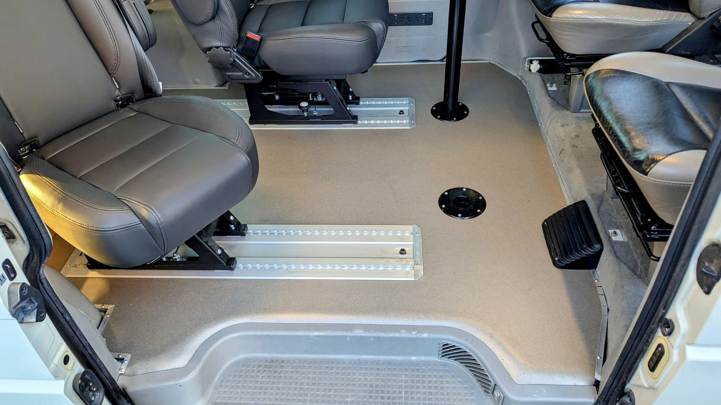 At the heart of the cabin is a versatile four-person workspace. We installed two rear Comfort Seats by VanEquipped, complete with eco-leather upholstery, 3-point harnesses, full 360° swivel capability, and integrated L-track mounting for secure positioning. Up front, the driver and passenger seats also swivel, allowing all four seats to rotate inward around a pair of modular work tables — perfect for data review, equipment setup, team meetings, or mission planning.