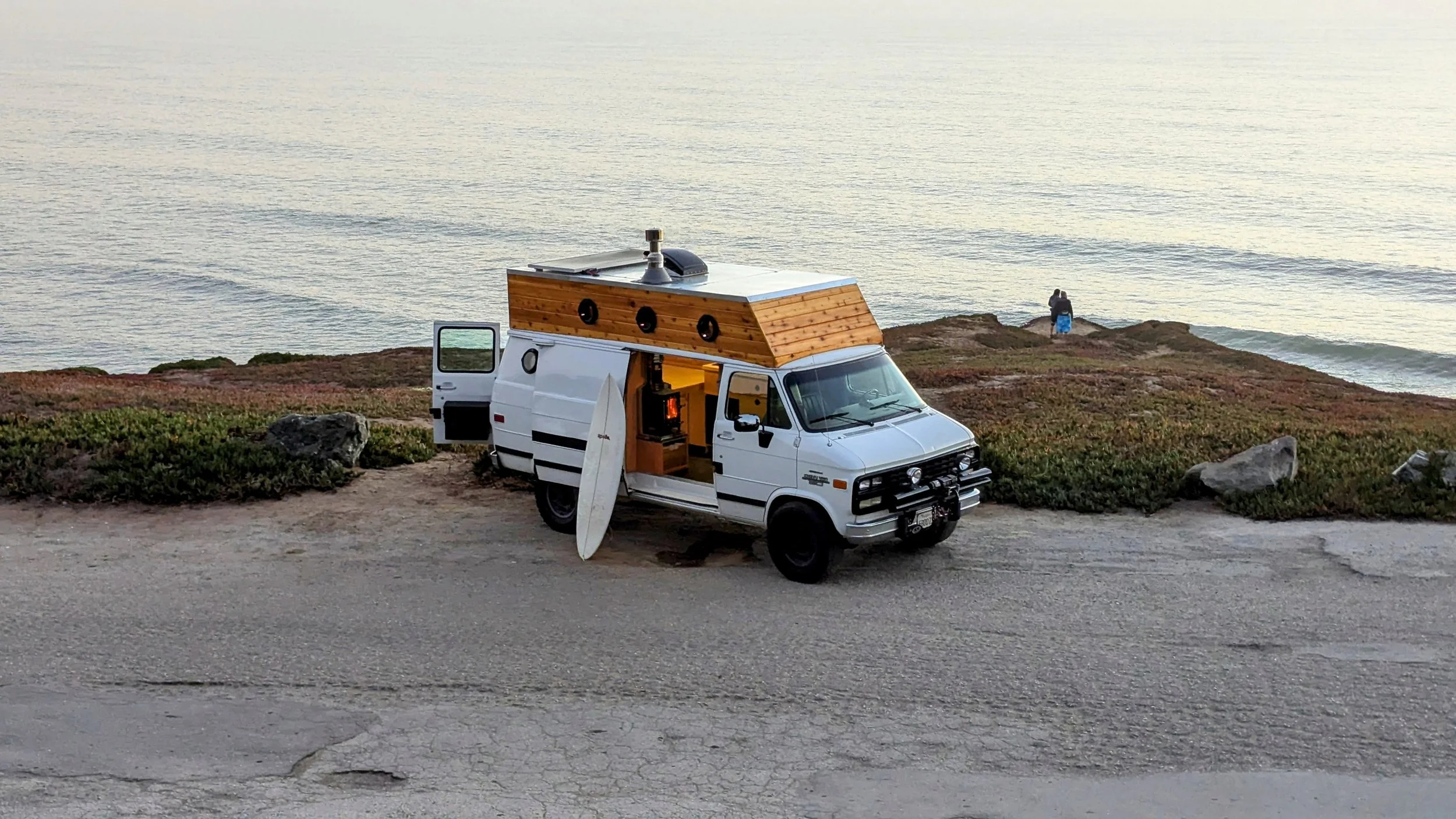Introducing our fully transformed 1994 Chevy G20, a classic van reimagined for comfort, style, and off-grid living. We gutted the interior and raised the roof, installing a custom cedar roof that allows full standing height, giving the space an open, airy feel while maintaining a warm, natural aesthetic.