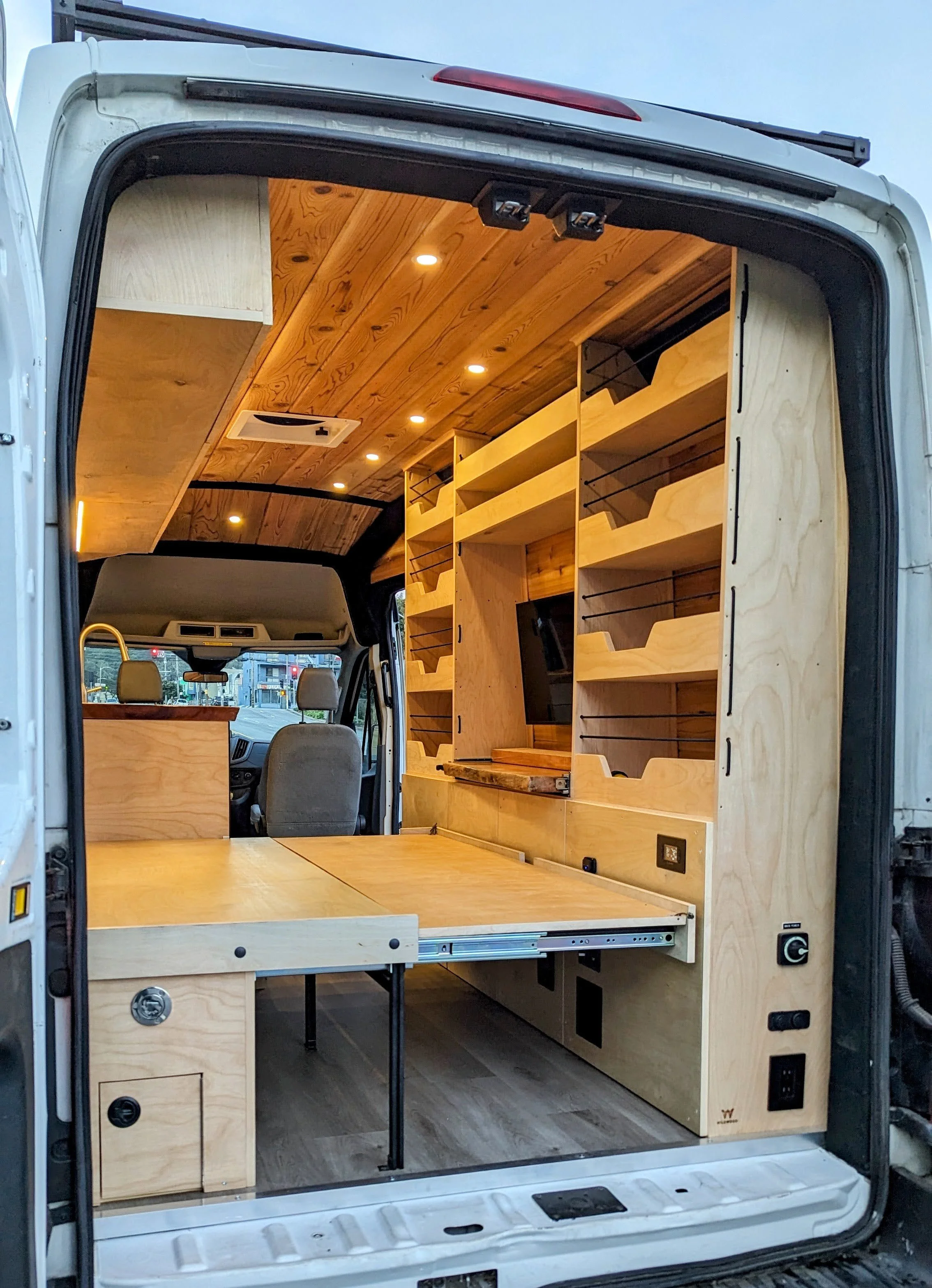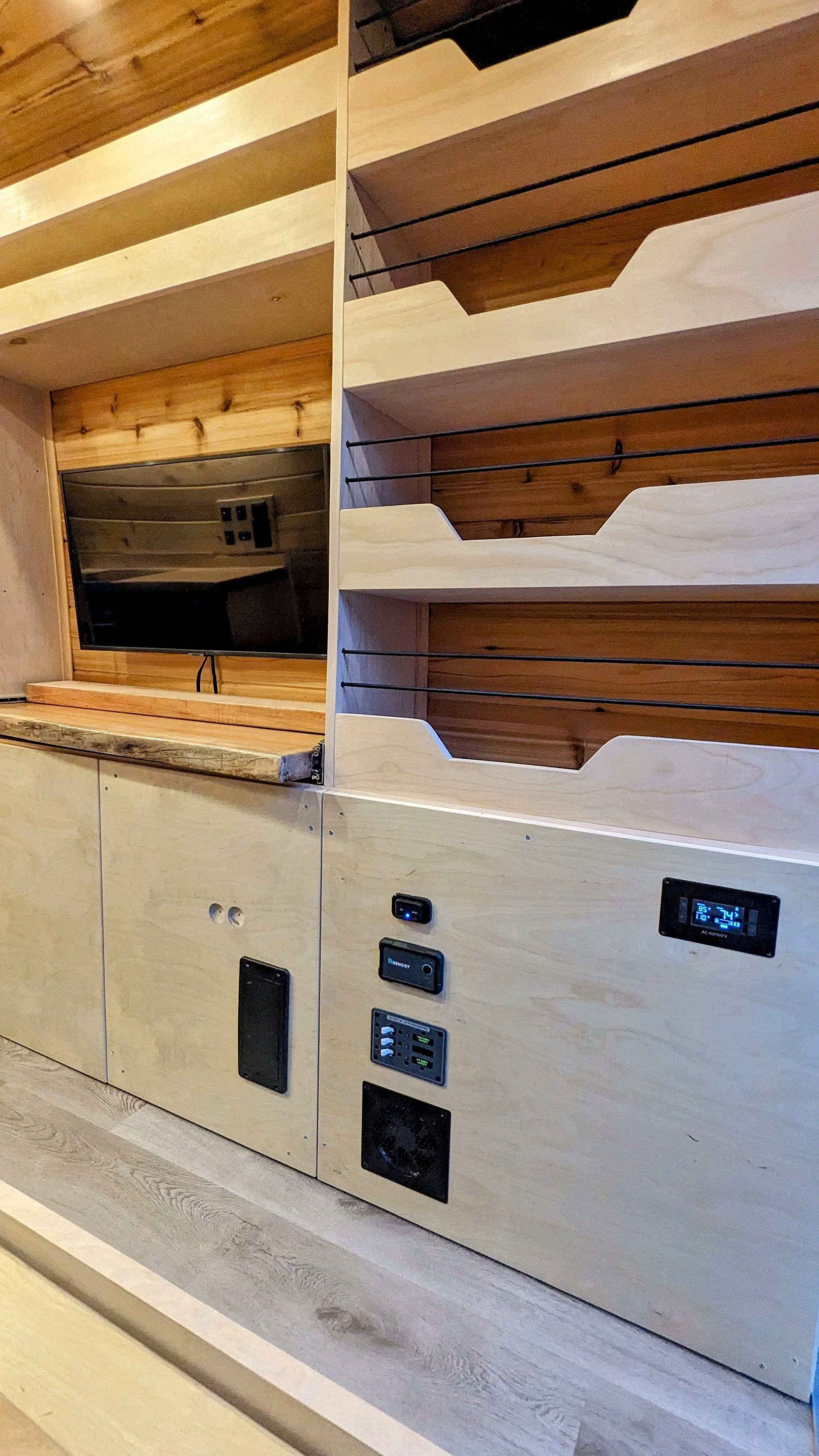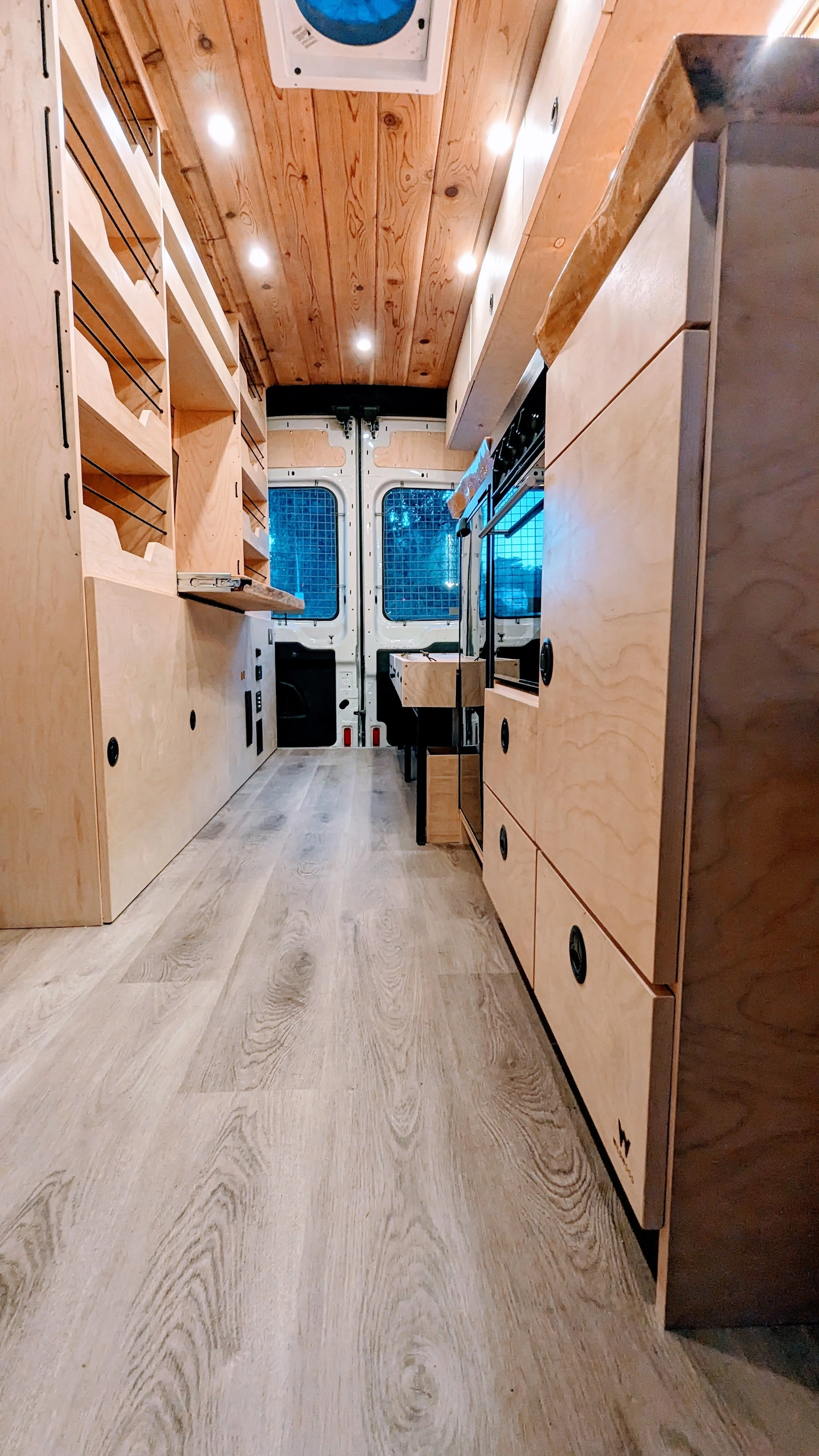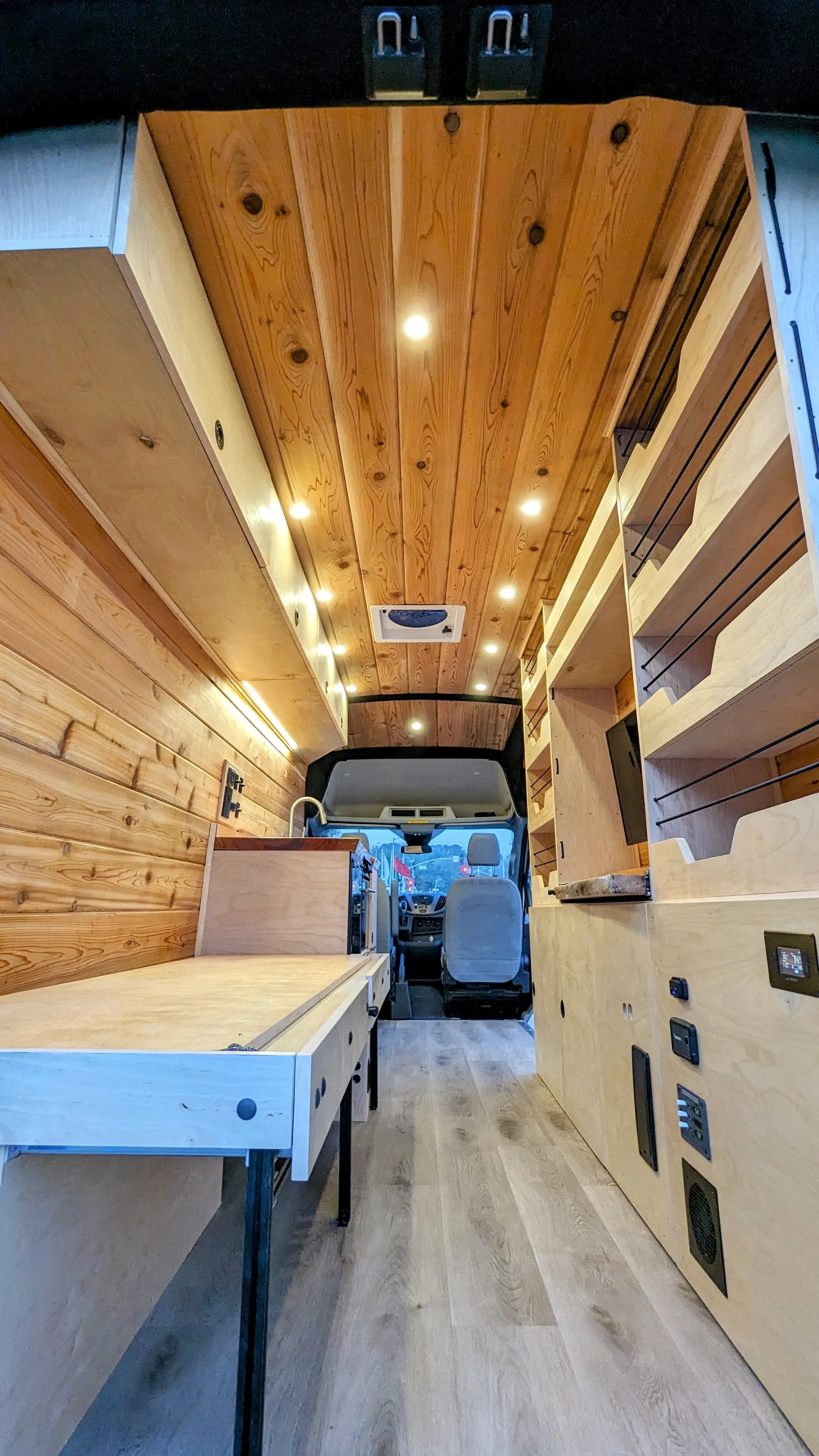 Embark on a journey of adventure with our custom campervan! This thought-out van boasts cedar paneling, birch interiors, and a custom pullout couch-to-bed conversion made from 8020 aluminum extrusion. The mobile kitchen features a custom live edge maple countertop, a 3 burner gas range, and a 3.2 cu Vitrifrigo 12v fridge, 18 gallons of running water, and the cozy warmth of a propane heater. Entertainment is covered with a flat-screen TV, while a pull-out desk and floor-to-ceiling cabinet provide practicality and ample storage. Powered by a 400w solar array and a 200ah lithium battery with Victron components, this van is your off-grid haven. The perfect blend of comfort, style, and functionality.