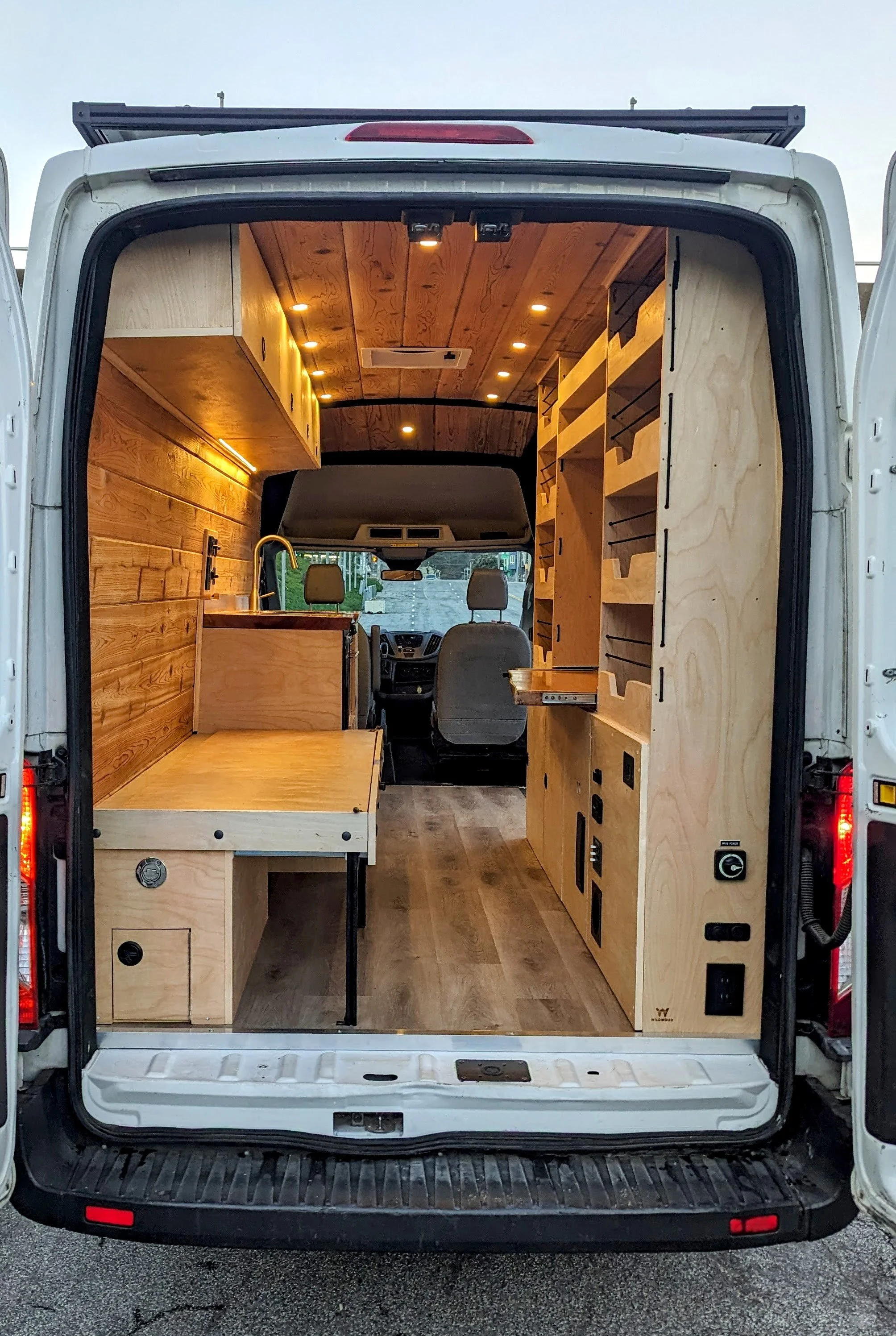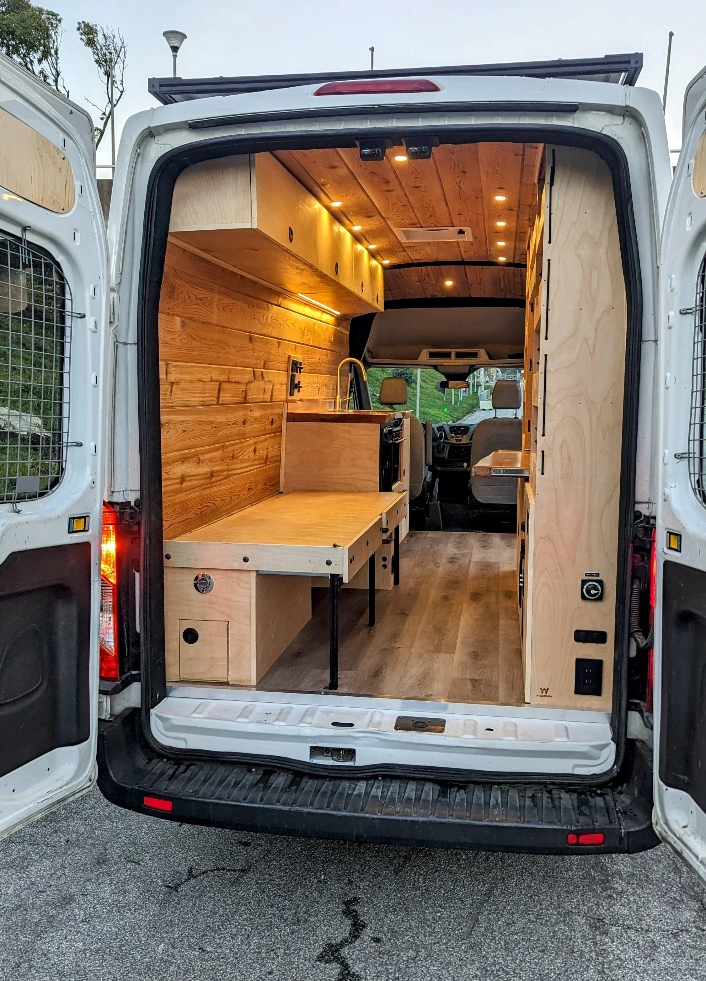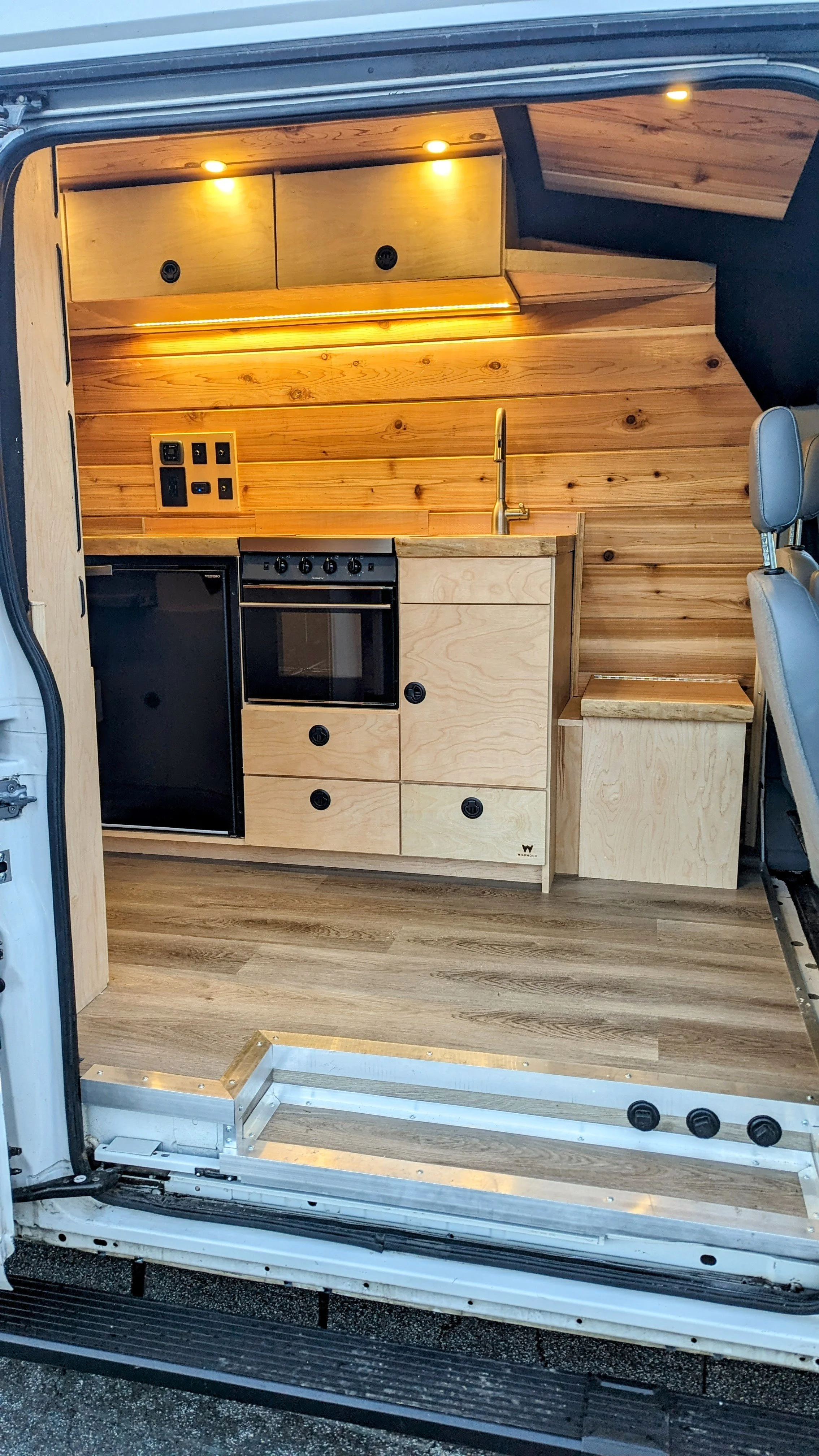 Embark on a journey of adventure with our custom campervan! This thought-out van boasts cedar paneling, birch interiors, and a custom pullout couch-to-bed conversion made from 8020 aluminum extrusion. The mobile kitchen features a custom live edge maple countertop, a 3 burner gas range, and a 3.2 cu Vitrifrigo 12v fridge, 18 gallons of running water, and the cozy warmth of a propane heater. Entertainment is covered with a flat-screen TV, while a pull-out desk and floor-to-ceiling cabinet provide practicality and ample storage. Powered by a 400w solar array and a 200ah lithium battery with Victron components, this van is your off-grid haven. The perfect blend of comfort, style, and functionality.