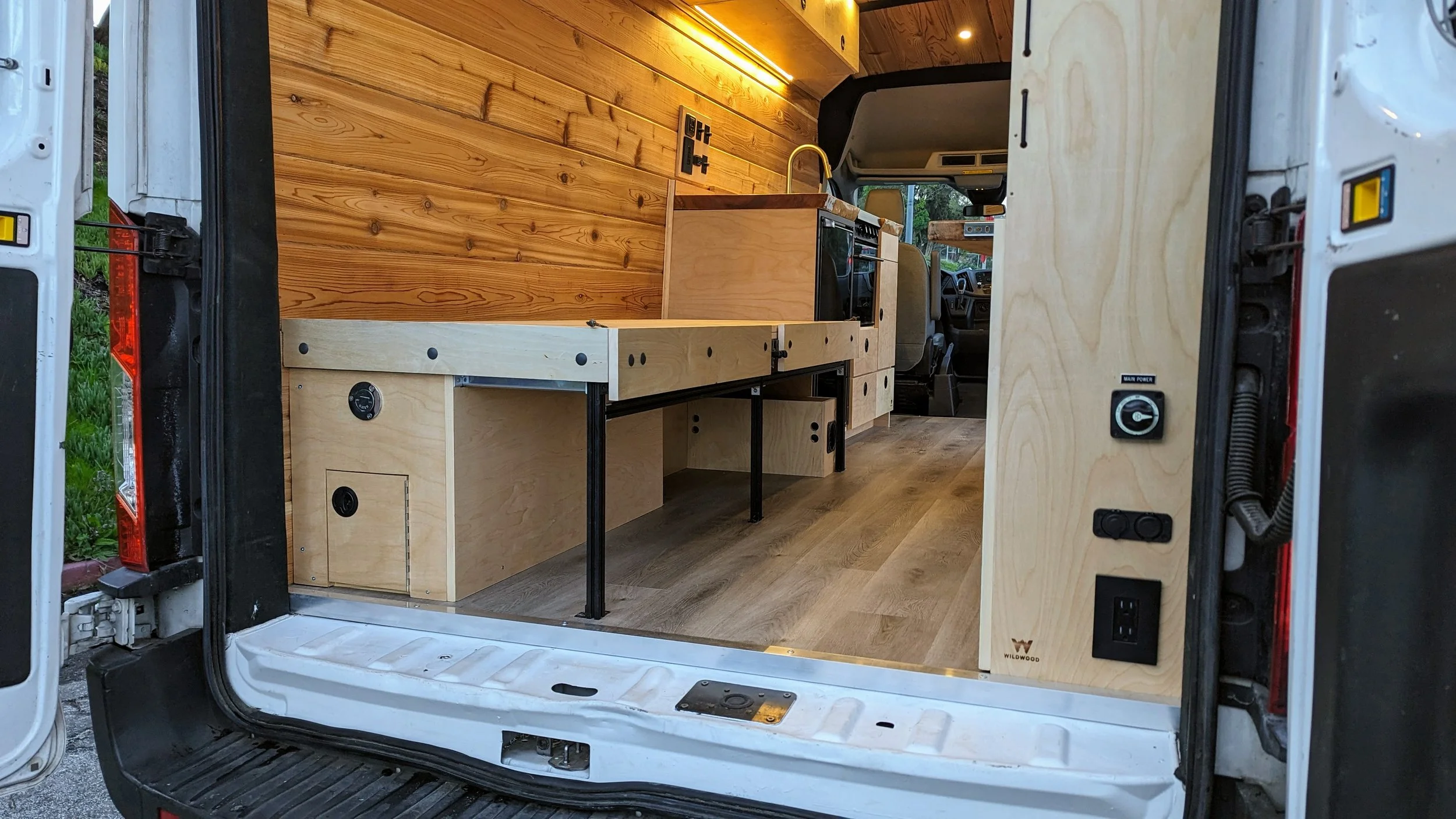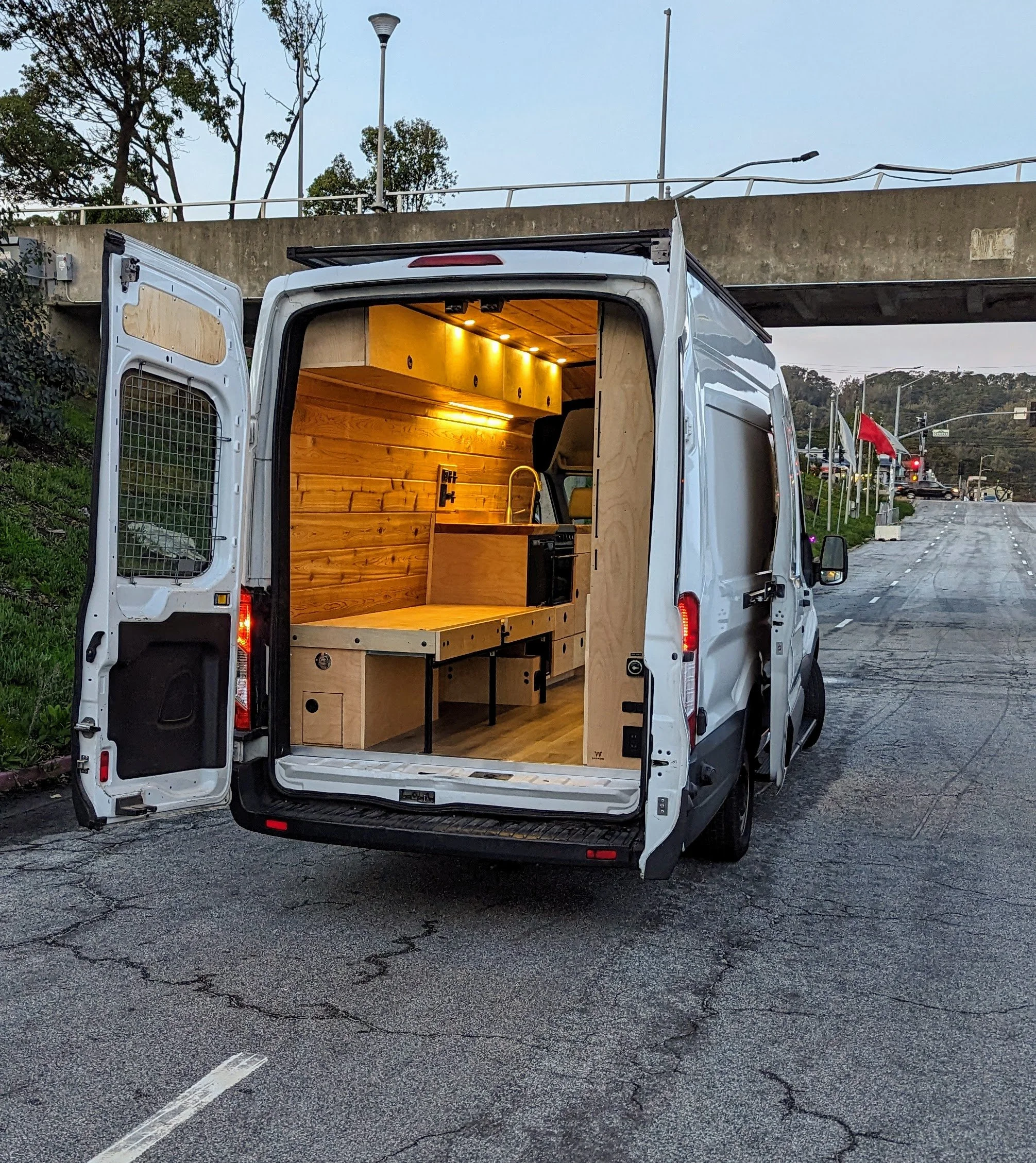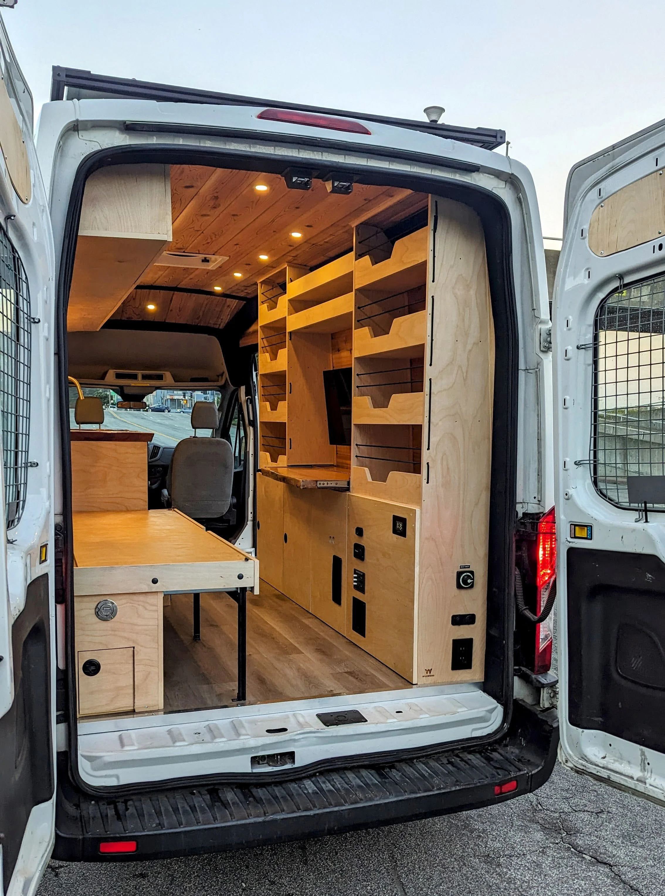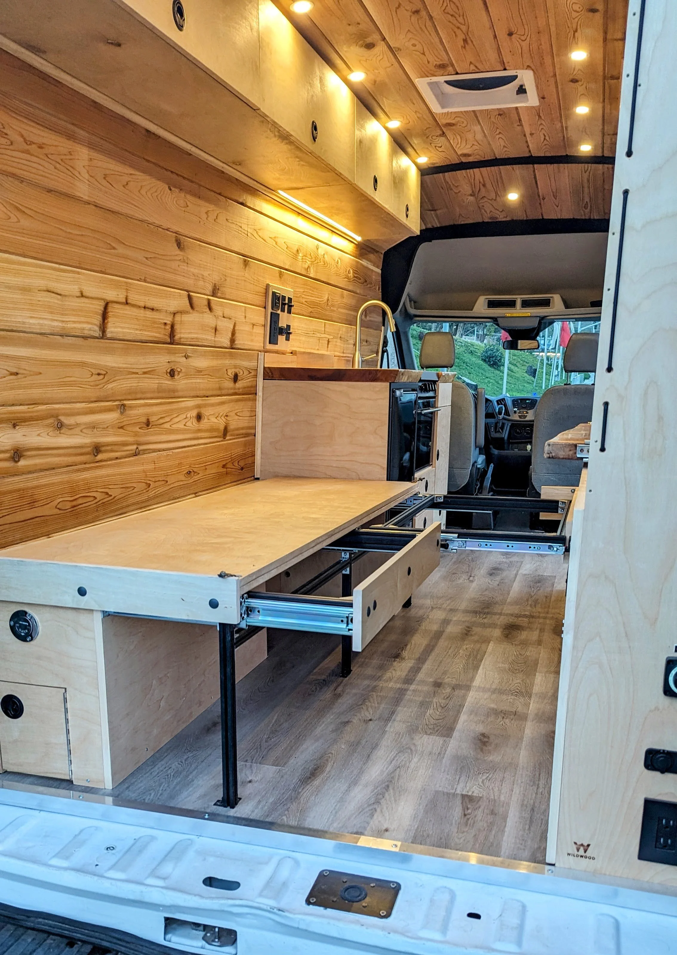 Embark on a journey of adventure with our custom campervan! This thought-out van boasts cedar paneling, birch interiors, and a custom pullout couch-to-bed conversion made from 8020 aluminum extrusion. The mobile kitchen features a custom live edge maple countertop, a 3 burner gas range, and a 3.2 cu Vitrifrigo 12v fridge, 18 gallons of running water, and the cozy warmth of a propane heater. Entertainment is covered with a flat-screen TV, while a pull-out desk and floor-to-ceiling cabinet provide practicality and ample storage. Powered by a 400w solar array and a 200ah lithium battery with Victron components, this van is your off-grid haven. The perfect blend of comfort, style, and functionality.