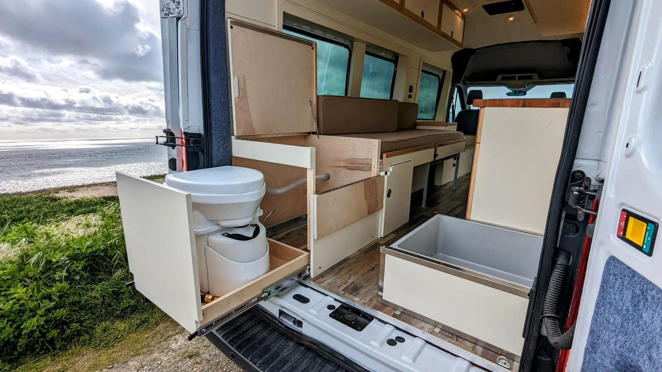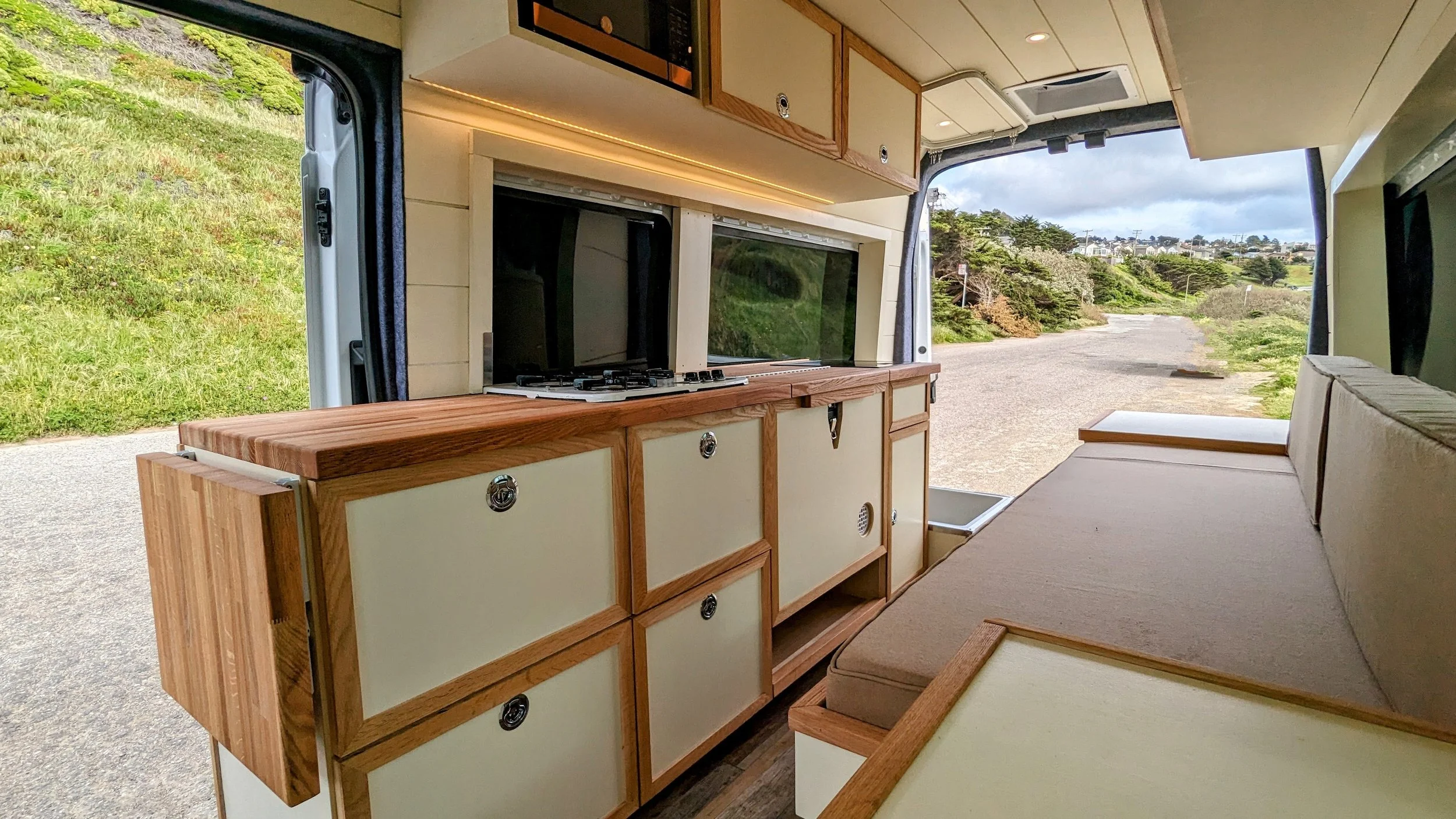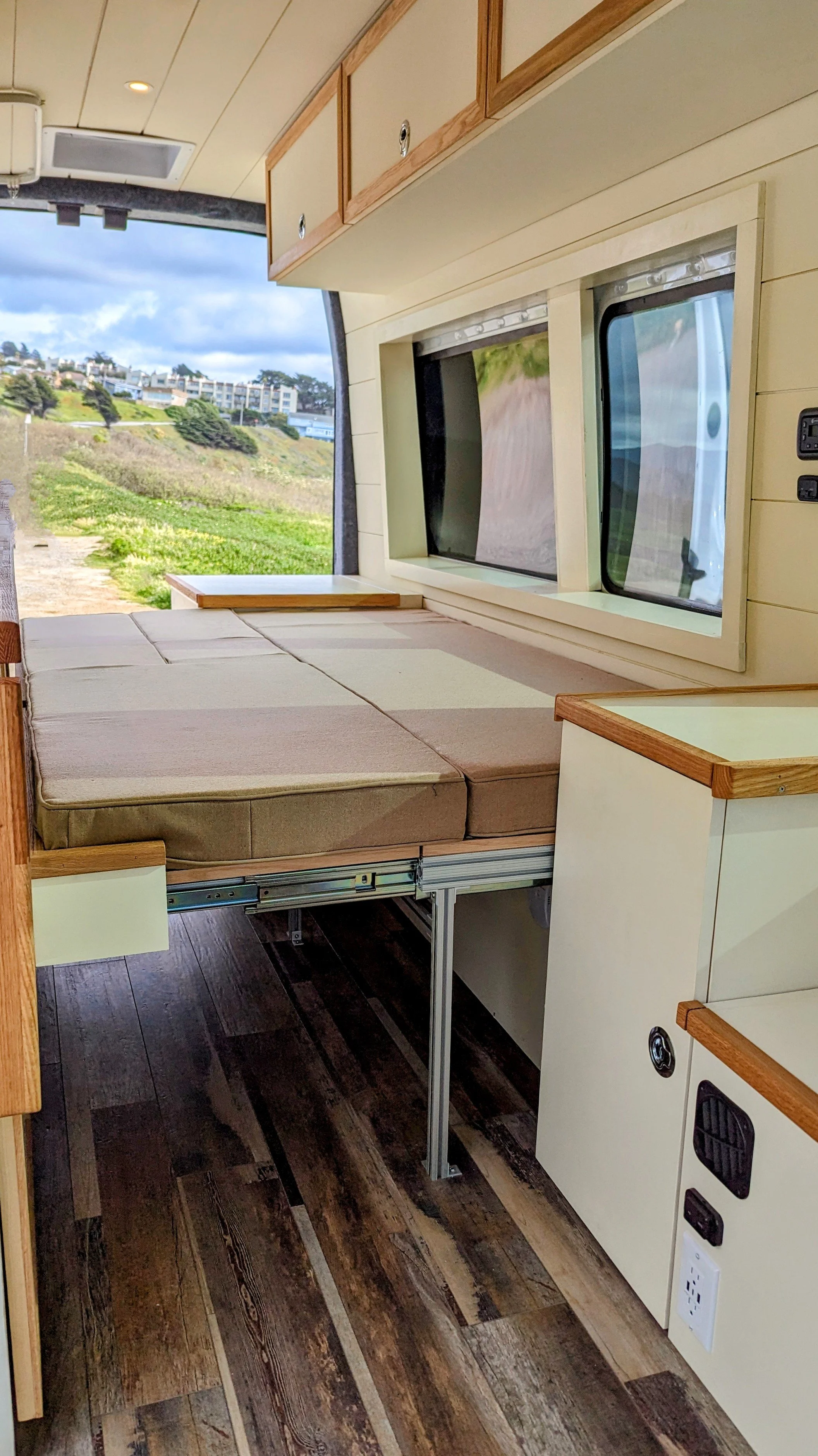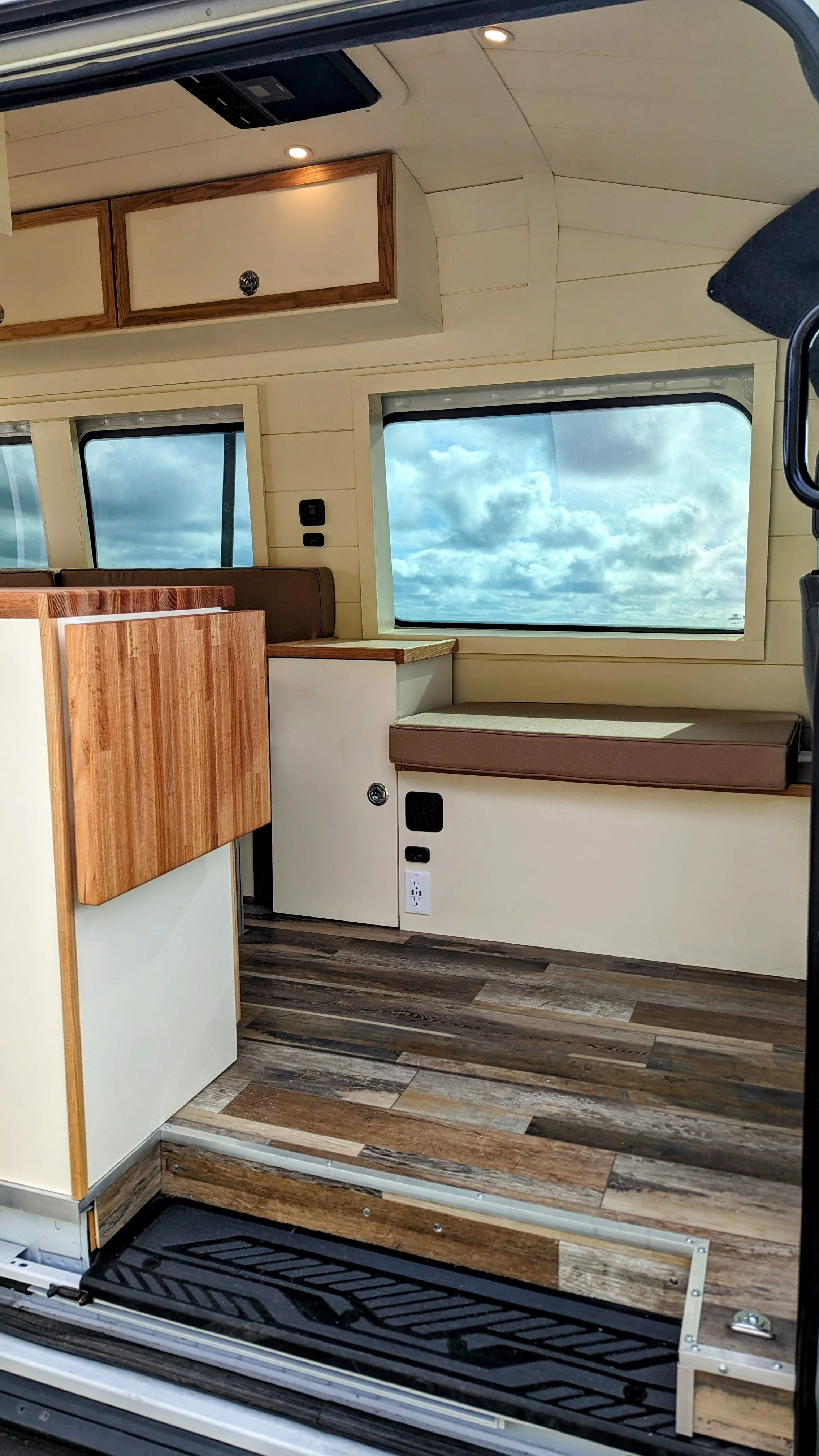 A large and spacious van filled with eco-friendly materials and room for a furry companion. This Transit is as large as they get and was built using birch and pine wood throughout the interior. Inside there are several amenities, like running hot and cold water, slide-out dry toilet, 600ah of power, murphy bed, and various storage compartments. The owner wanted a vehicle that maximized space but could also be used as a live/ workspace. The murphy bed folds up and a work table can fill the space giving room for multiple people or a simple office. The kitchen, accented with beautiful drawer pulls, handles, and a brass faucet makes this rig stand out! It comes with a 1.3-gallon hot water heater, a 23-gallon freshwater tank, and a mini-fridge. The van is powered by 400w solar pannes and (3) 200ah lithium batteries leaving plenty of power to handle any electrical needs.