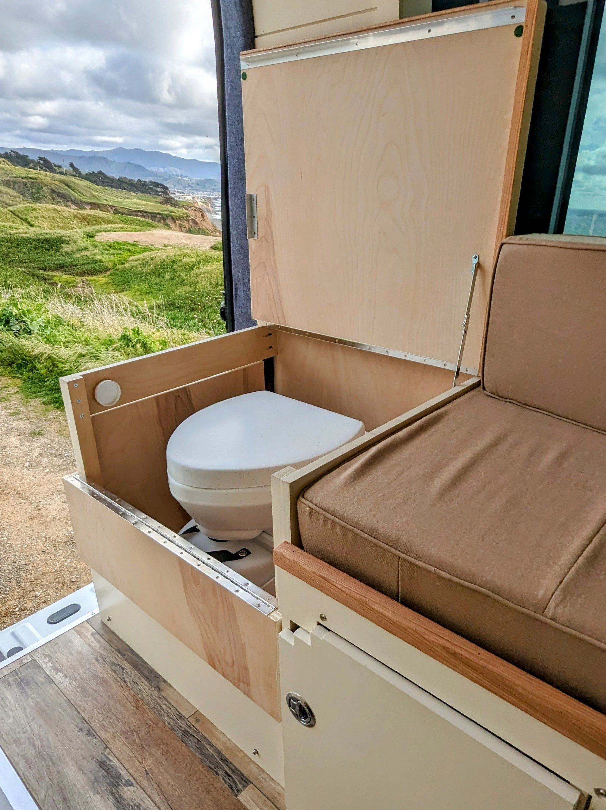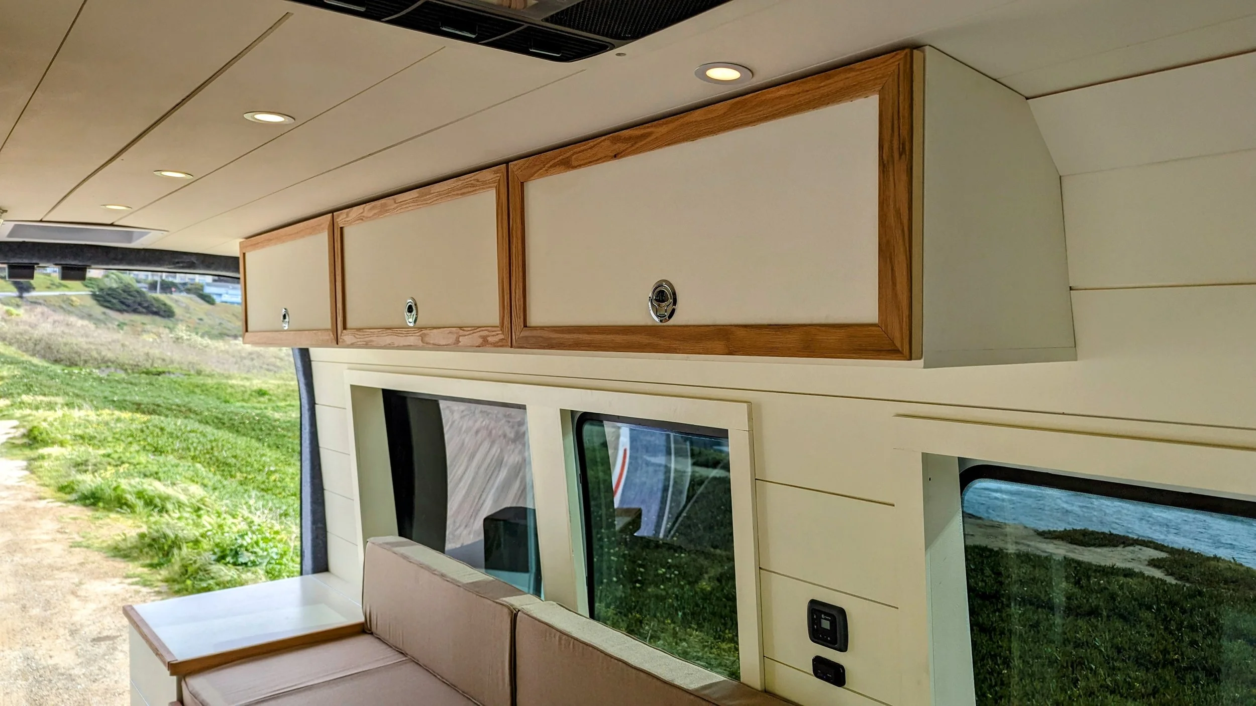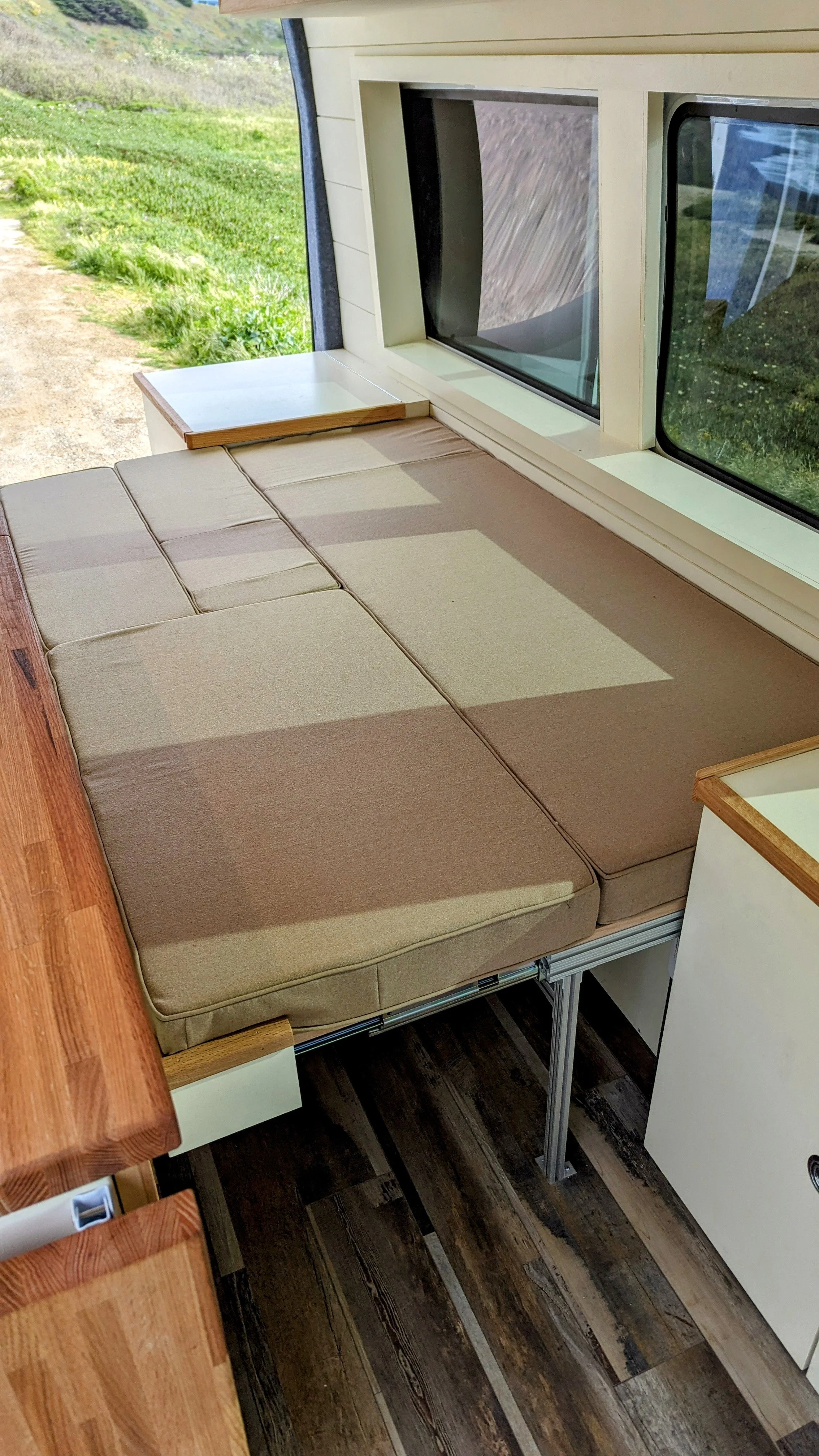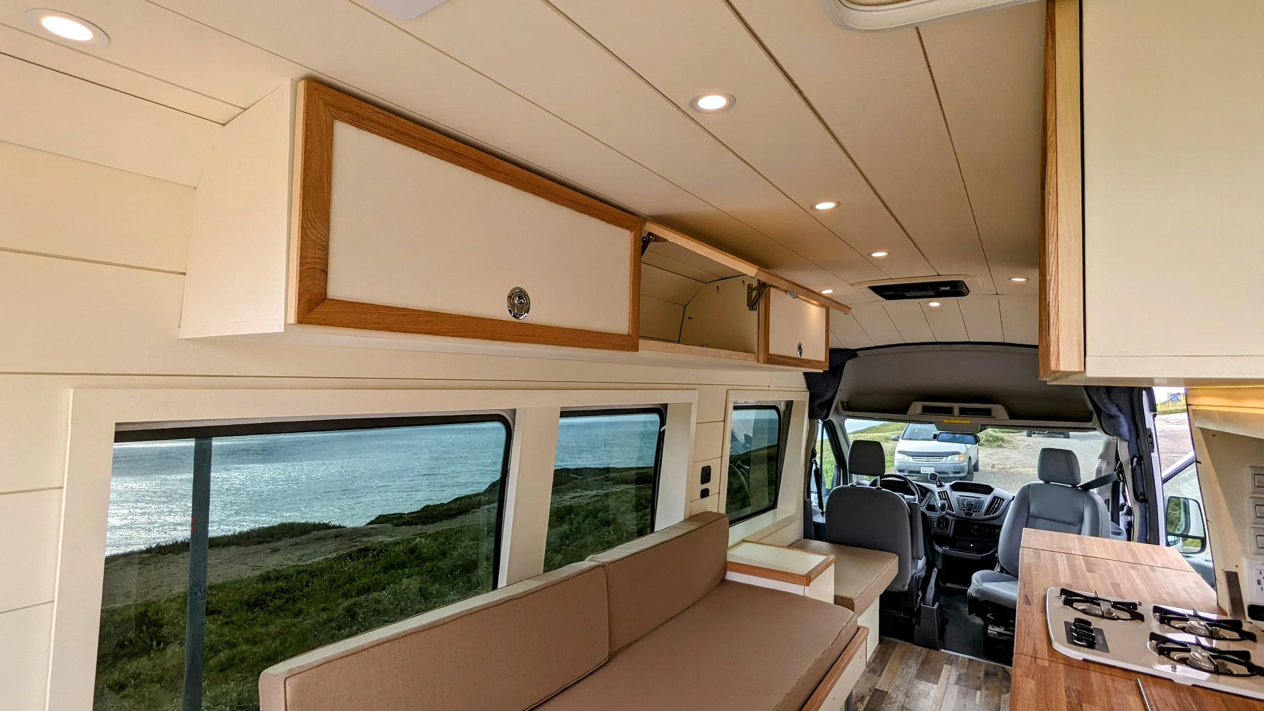 A large and spacious van filled with eco-friendly materials and room for a furry companion. This Transit is as large as they get and was built using birch and pine wood throughout the interior. Inside there are several amenities, like running hot and cold water, slide-out dry toilet, 600ah of power, murphy bed, and various storage compartments. The owner wanted a vehicle that maximized space but could also be used as a live/ workspace. The murphy bed folds up and a work table can fill the space giving room for multiple people or a simple office. The kitchen, accented with beautiful drawer pulls, handles, and a brass faucet makes this rig stand out! It comes with a 1.3-gallon hot water heater, a 23-gallon freshwater tank, and a mini-fridge. The van is powered by 400w solar pannes and (3) 200ah lithium batteries leaving plenty of power to handle any electrical needs.